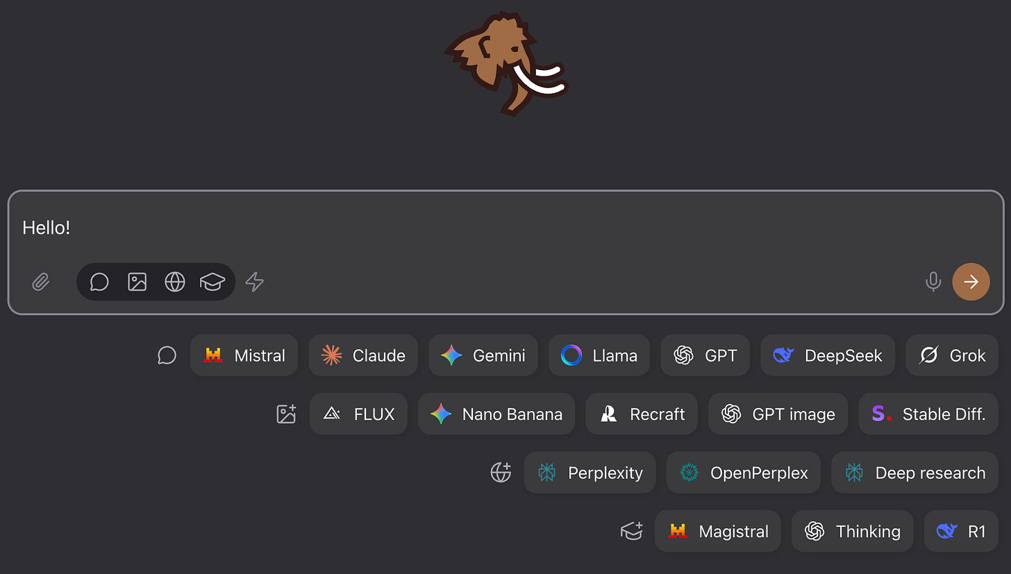 However, sometimes you need raw power. For that, I started using Mammouth. I use this less for privacy reasons and more for the sheer value and flexibility. Getting access to every major AI model (including image generation) for just €10 is incredible value.
