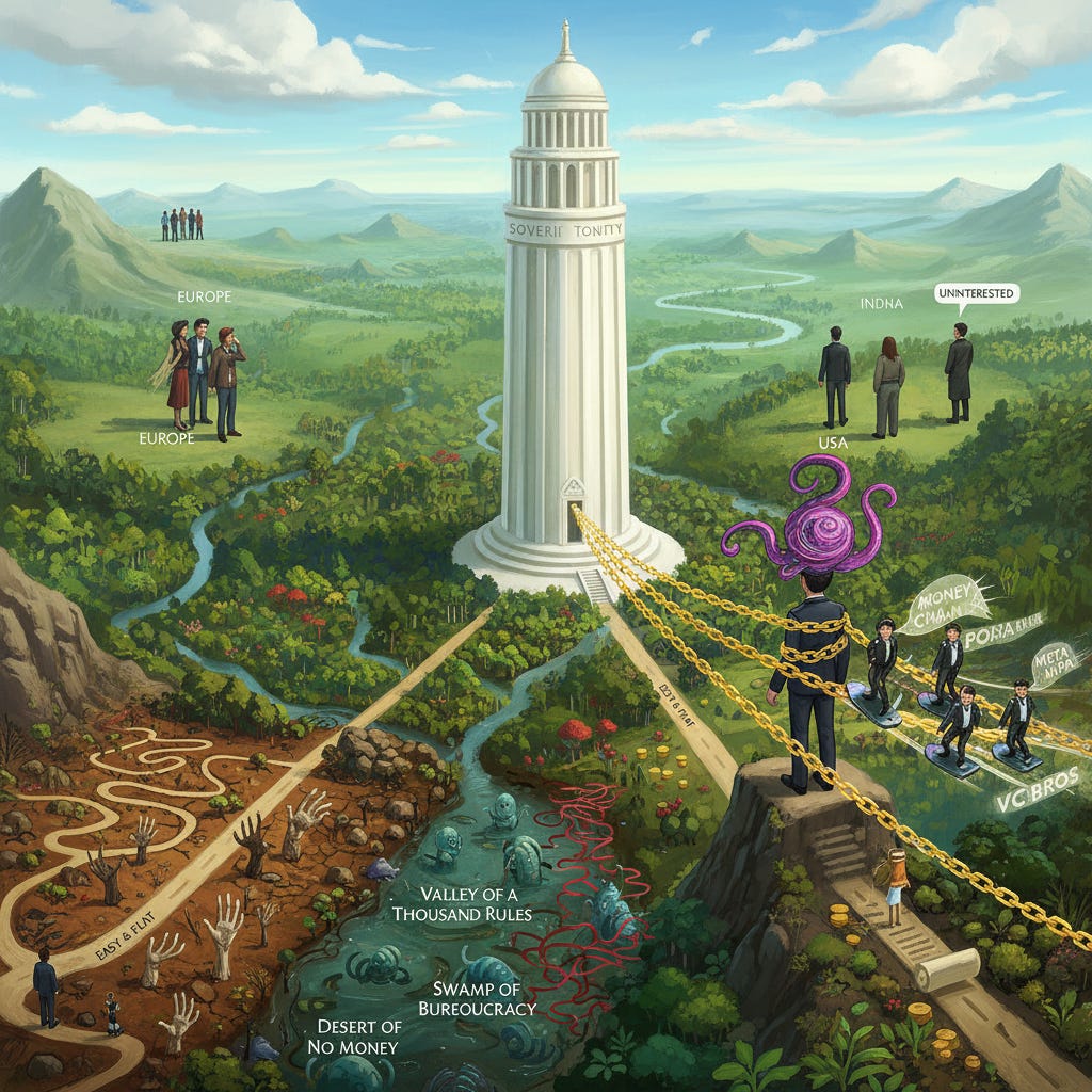 I always like to think about it this way: Imagine Sovereignty is this Ivory Tower standing in the middle of the country. The country I’m talking about is very bio-diverse. Now, around this tower, far away, are standing people looking at it. Each person represents a country. Some people are standing closer together (Europe), others are farther away from each other (USA, India, China). On our way to the ivory tower, we can see the valley of a thousand rules, the desert of no money, and the swamp of burocrazy. On the other side, there is USA standing. They are not far away from sovereignty, but they are very tightly connected to the ivory tower by the money chain, the political mind eater, and the VC bros pushing you from hype to hype. For every country, this perspective looks different. For some, it is easy and flat, dictating a rule and spending money. Others have no chance than to ask for a helping hand. And for some more, this topic is completely uninteresting.
